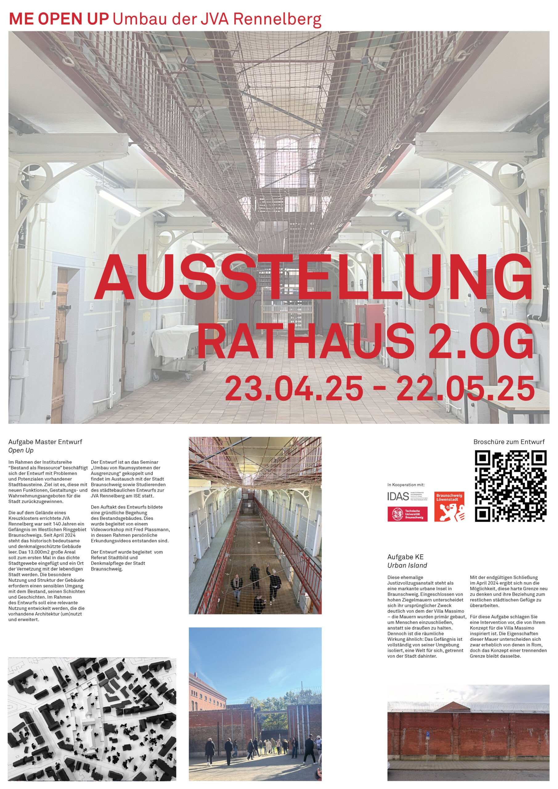 Die auf dem Gelände eines Kreuzklosters errichtete JVA Rennelberg war seit 140 Jahren ein Gefängnis im Westlichen Ringgebiet Braunschweigs. Seit April 2024 steht das historisch bedeutsame und denkmalgeschützte Gebäude leer. Das 13.000m2 große Areal soll zum ersten Mal in das dichte Stadtgewebe eingefügt und ein Ort der Vernetzung mit der lebendigen Stadt werden. Die besondere Nutzung und Struktur der Gebäude erfordern einen sensiblen Umgang mit dem Bestand, seinen Schichten und Geschichten. Im Rahmen des Entwurfs soll eine relevante Nutzung entwickelt werden, die die vorhandene Architektur (um) nutzt und erweitert.